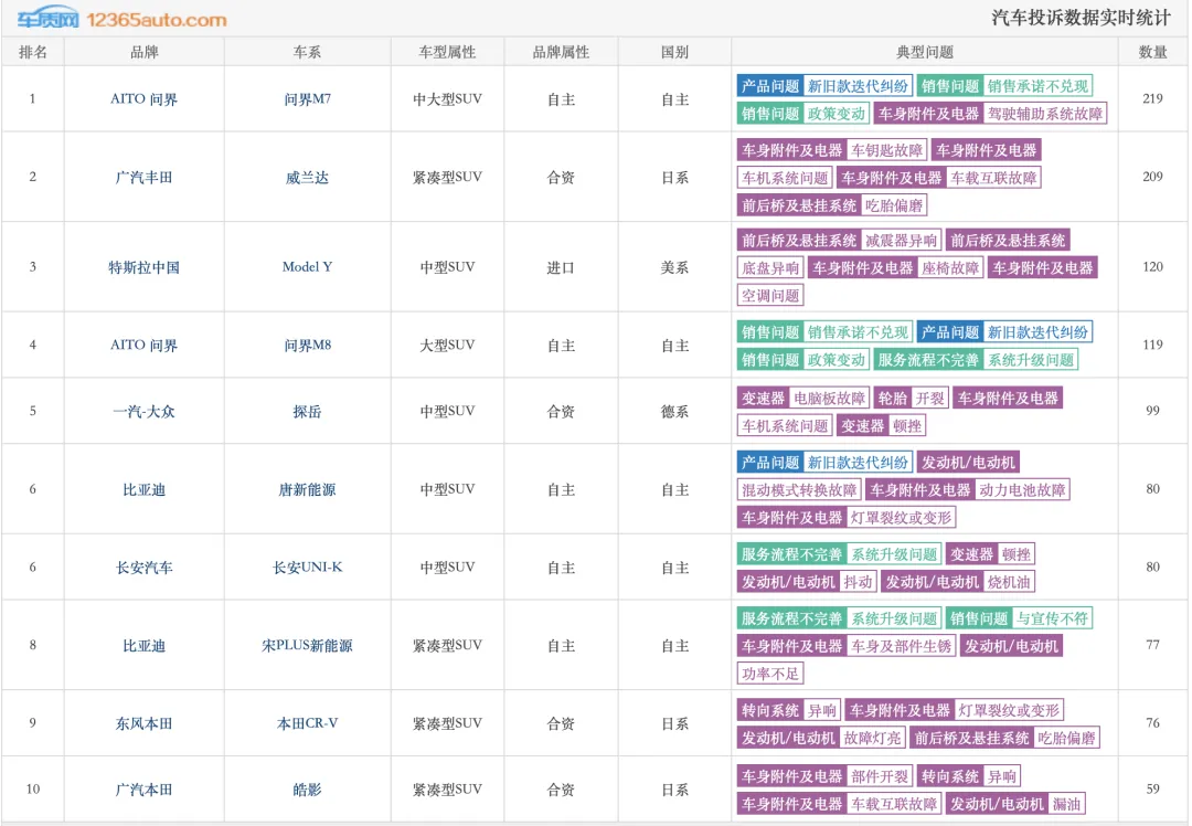 2026 年 3 月 SUV 车型投诉实时统计榜单,AITO 问界 M7 以 219 条投诉量登顶榜首,广汽丰田威兰达、特斯拉 Model Y 分列二、三位,问界 M8 以 119 条投诉跻身第四,问界两款车型包揽榜单前四席位,成为当月投诉量最高的品牌。