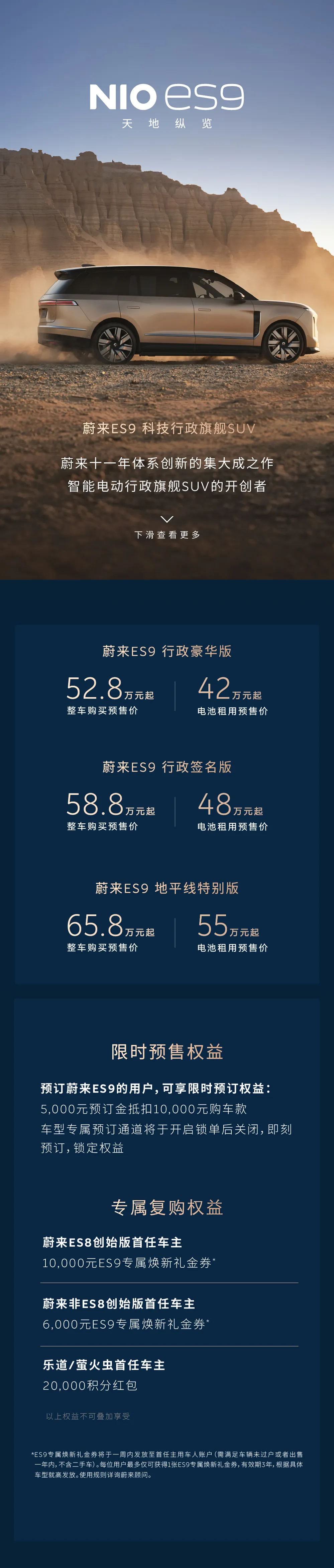科技行政旗舰SUV——蔚来ES9正式发布并开启预售。ES9是蔚来十一年体系创新的集大成之作,是智能电动行政旗舰SUV品类的开创者。ES9行政豪华版预售价528,000元起,采用BaaS电池租用方式购买,预售价420,000元起;行政签名版预售价588,000元起,采用BaaS电池租用方式购买,预售价480,000元起,地平线特别版预售价658,000元起,采用BaaS电池租用方式购买,预售价550,000元起。