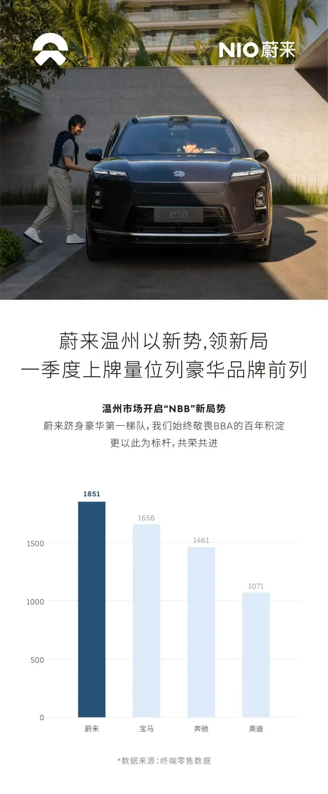 2026年第一季度,蔚来公司旗下车型在温州地区上牌量达1851台,持续超越传统豪华品牌,这不仅是温州市场对蔚来的高度认可,更标志着蔚来正式开启「NBB」发展新格局。