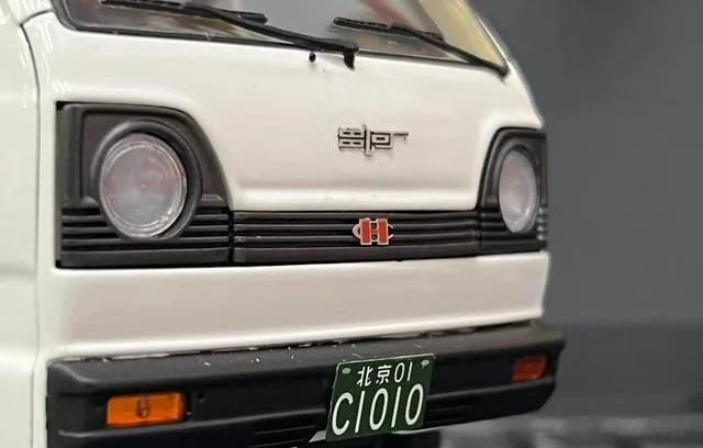 这个特写是昌河CH1010的鼻子,一对圆灯死死地杵在黑色格栅两边,中间那个“昌河”字样和红色车标,老一辈看一眼都笑,说“这小面儿,走哪都能认出来”,面对面打出租,司机只认准这个,油漆新时是奶白色,时间一长蹭上灰,有种说不出的老派,车牌C1010,哪个大院的老司机没见过,电瓶在副驾驶底下卡着,以前躲雨,大家都围着这车蹲,磕点瓜子天就过去了。