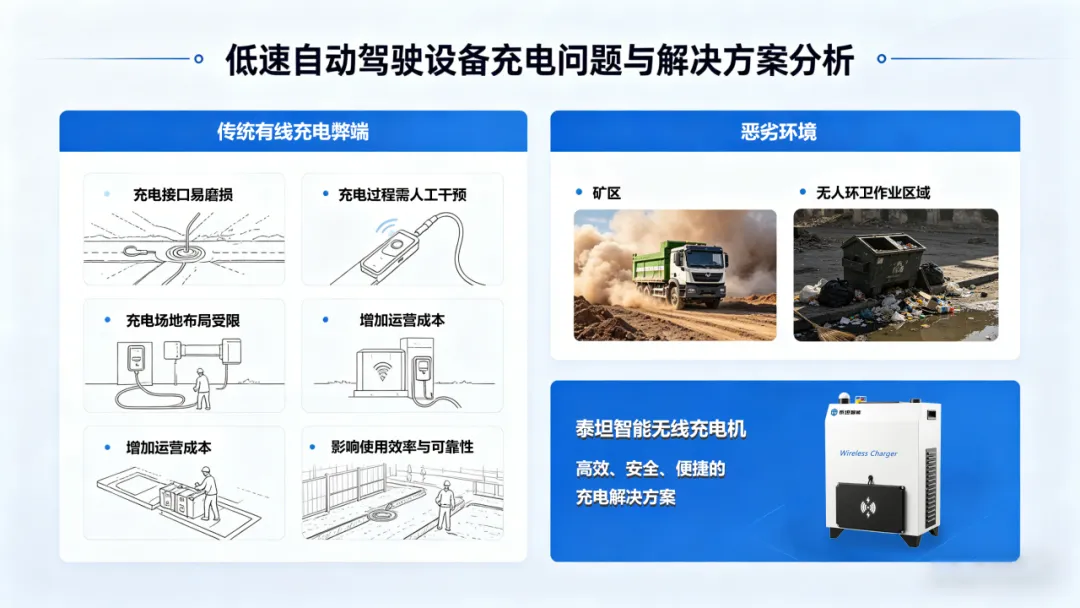 随着低速自动驾驶设备在各个领域的广泛应用,充电问题成为制约其进一步发展的关键因素。传统有线充电方式存在诸多弊端,如充电接口易磨损、充电过程需人工干预、充电场地布局受限等,不仅增加了设备的运营成本,还影响了其使用效率和可靠性。特别是在一些恶劣环境下,如矿区、无人环卫作业区域等,有线充电的安全性和便捷性更是面临严峻挑战。因此,市场迫切需要一种更加高效、安全、便捷的充电解决方案。