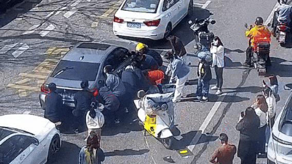 众人合力将轿车抬起