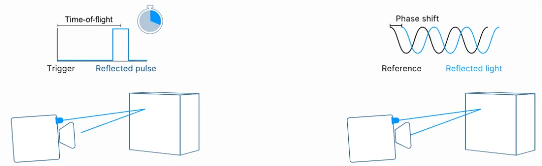- 通过连续发射光脉冲(一般为不可见光)到被观测物体上,然后接收从物体反射回去的光脉冲,通过探测光脉冲的往返飞行时间来计算被测物体离相机的距离;分辨率较低,适合远距离3D感知。无人机的避障技术、自动驾驶的激光雷达都是基于此原理,发射的线束数量越多,成像越精细