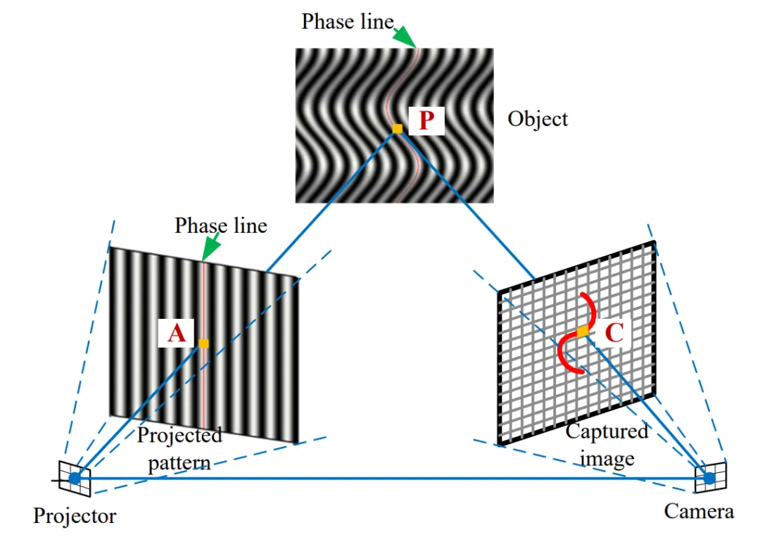 - 算是近些年在工业界新的技术,用于测量镜面、高反的物体表面形状,结构光技术面对镜面反射率大的物体就束手无策了。相位偏折技术通常由一个显示屏和一个2D相机组成,显示屏投射一系列编码的条纹在物体表面,相机同步捕获变形的条纹,通过物体表面梯度再积分就可以重构镜面物体的面型了