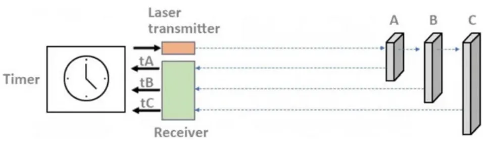用的技术:飞行时间(Time of Flight),当然还有基于其它技术的(双目、结构光等)