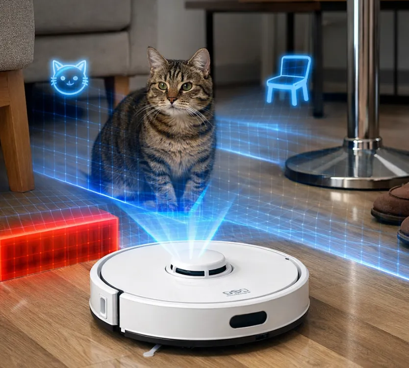 侧向或前向的固定ToF传感器,用于检测与墙壁或低矮障碍物的精确距离,实现贴边清扫或减速避让。向下发射的ToF传感器检测地面是否存在(如楼梯口),若飞行时间突然大幅增加(距离突变)则判断为悬空