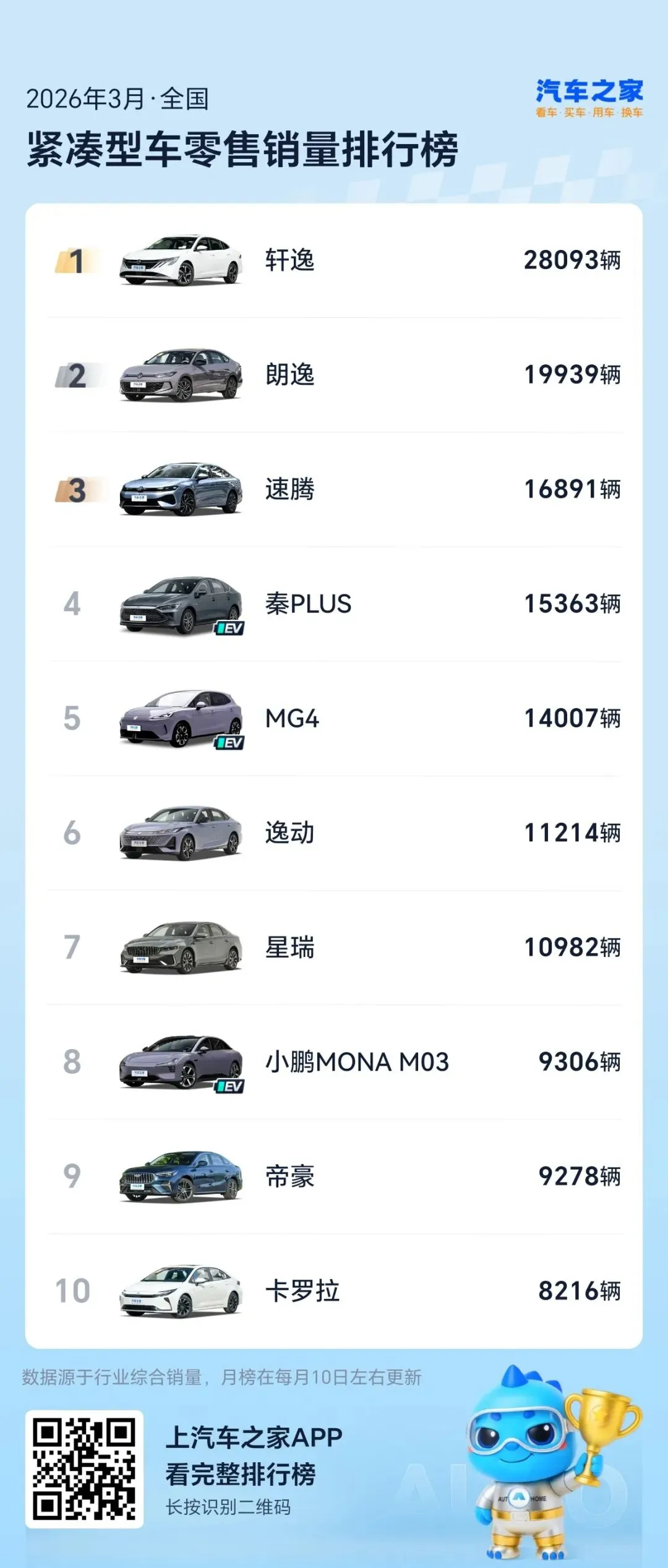 3月紧凑型轿车销量出炉:燃油车包揽前三,新款轩逸登顶,比亚迪秦PLUS升至第4,MG4 小鹏MONA M03杀回前十,艾瑞泽8跌出前十