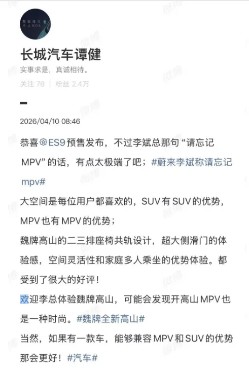 作为长城汽车旗下主打高端MPV市场的品牌,魏牌凭借高山车型在MPV赛道站稳脚跟。面对李斌的言论,谭健第一时间在社交平台发声,先是对蔚来ES9预售发布表示祝贺,随后直白表达不同看法,认为“请忘记MPV”的说法太过极端。他明确指出,SUV与MPV并非替代关系,而是各有各的不可替代优势,大空间是所有车型的共同追求,但不同车型的场景化价值,有着天壤之别。