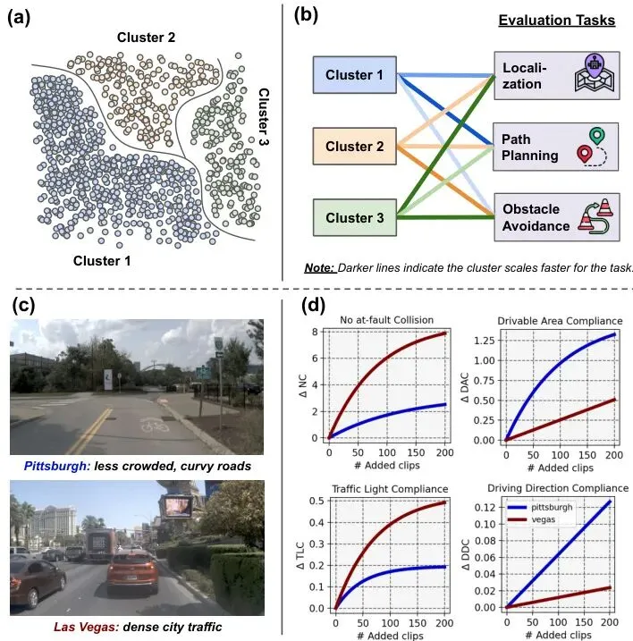 第一步:分门别类,并给数据“贴标签”面对杂乱的数据池,先根据特征(比如地理位置、场景语义描述)把它们聚类成几个“域”(Domain)。例如,把所有在“波士顿复杂环岛”采集的数据放一堆,把“拉斯维加斯夜间高速”的数据放另一堆。同一堆里的数据,被认为对模型性能有相似的影响。
