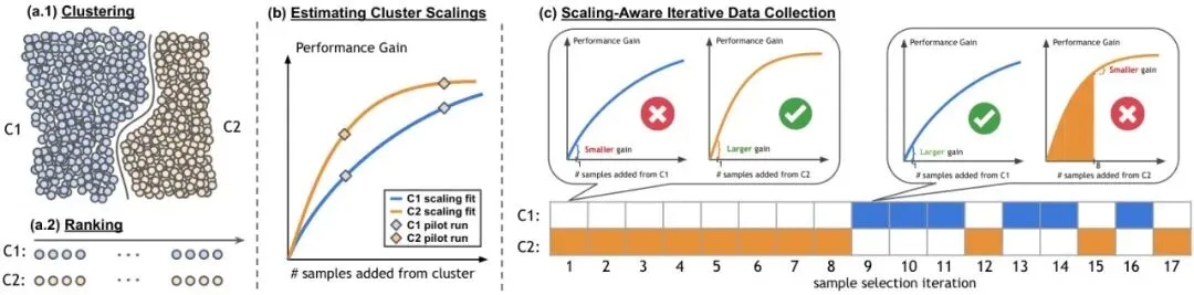 第三步:精打细算,迭代式“挖矿”现在,我们有了一堆分好类、排好序的“矿脉”(数据聚类),以及每一条矿脉的“产出预测报告”(缩放定律)。手里还有有限的“挖掘预算”(数据选择预算B)。