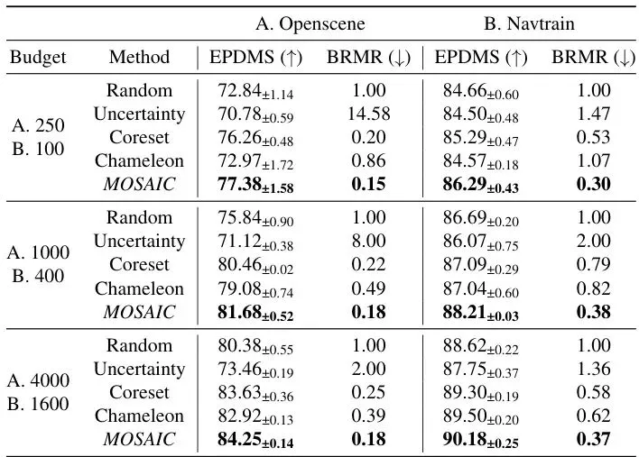 这篇论文解决了一个非常实际且“烧钱”的问题:如何用更少的数据,训练出更好的自动驾驶模型。 它没有在模型结构上搞花活,而是把目光投向了数据本身,提出了一套名为MOSAIC的通用数据选择框架。思路清晰,实验扎实,结果惊艳(数据效率提升高达80%),对于任何面临数据爆炸和算力瓶颈的AI应用(尤其是自动驾驶、机器人等物理AI领域)都有很强的借鉴意义。英伟达出品,必属精品!