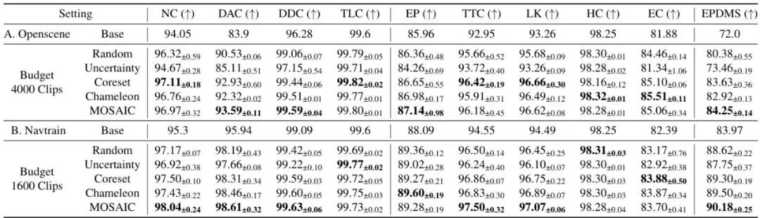 光说不练假把式。论文在两大自动驾驶数据集OpenScene和Navtrain上,用2024年NAVSIM挑战赛的冠军模型Hydra-MDP进行了验证。评价指标是关键:EPDMS(Extended Predictive Driver Model Score,扩展预测驾驶员模型分数)。这不是一个简单的准确率,而是综合了9项驾驶规则遵守指标(如碰撞避免、交通灯遵守、车道保持、舒适度等)的复合分数,被认为与真实闭路驾驶性能强相关。MOSAIC对比了多种基线方法:随机选择、基于预测不确定性的选择、追求特征多样性的Coreset,以及另一种先进的数据混合方法Chameleon。太惊艳了!在OpenScene数据集上,当预算为250个数据片段时,MOSAIC的EPDMS达到了77.38,显著高于其他方法。更厉害的是BRMR(Budget Ratio to Match Random)这个指标,它意思是“要达到随机选择同预算下的性能,本方法需要多少比例的数据”。MOSAIC的BRMR是0.15!这意味着,MOSAIC只用随机选择所需数据量的15%,就能达到后者用100%数据达到的性能,数据效率提升了85%!在Navtrain数据集上,效率提升也高达约70%。从表2可以看出,MOSAIC并非在某一个指标上疯狂“刷分”,而是有策略地实现全面、均衡的提升。它会敏锐地发现模型的短板(例如OpenScene中的DAC-碰撞避免),并优先选择能弥补这些短板的数据,从而实现综合分数(EPDMS)的最大化。深入剖析:聚类和缩放定律缺一不可