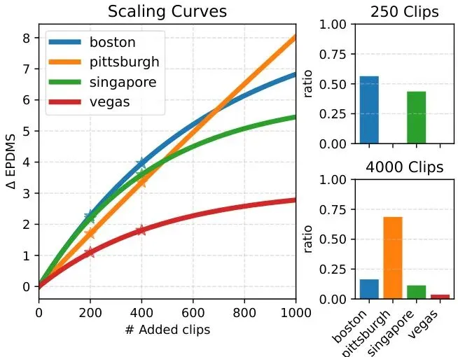 MOSAIC为什么这么强?论文通过一系列分析图揭示了其内在逻辑。我们来看OpenScene实验,数据按地理位置分成了四个城市聚类。图3(左)展示了拟合出的四条缩放曲线,差异巨大!波士顿和新加坡的数据在初期“性价比”极高,加一点分就涨很多,但很快就饱和了。匹兹堡的数据则属于“长跑型”,提升稳健持久。拉斯维加斯的数据… 嗯,贡献有限。这张图就像MOSAIC的“决策日记”。在预算很少的初期(前几百次迭代),它几乎只从波士顿和新加坡挖数据,因为这里的边际收益最高。随着这两处“富矿”被开采得差不多,收益下降,匹兹堡稳健的收益曲线变得更有吸引力,成为中期主力。等到后期,所有主要矿脉都接近饱和,它才会去开采之前看不上的拉斯维加斯数据。图3(右)的饼图也印证了这一点。论文还通过消融实验证明,聚类和缩放定律这两大核心组件缺一不可。只用聚类(不拟合缩放定律)或者只用全局缩放定律(不聚类),效果都远不如完整的MOSAIC。这充分说明了“分域预测,动态调配”这一策略的威力。局限与展望:通用框架的潜力与挑战
