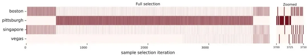 “边际收益”是经济学概念,这里指再多加一份数据,能多带来多少性能提升。由于缩放定律是饱和曲线,边际收益会随着从同一个堆里挖的数据增多而递减。当“波士顿环岛”堆的边际收益下降到不如“拉斯维加斯高速”堆时,MOSAIC就会果断切换“矿场”。