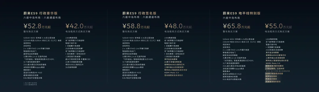 ES9 提供三款配置,预售价清晰透明:行政豪华版 52.8 万元起,BaaS 电池租用方案 42 万元起;行政签名版 58.8 万元起,BaaS 方案 48 万元起;地平线特别版 65.8 万元起,BaaS 方案 55 万元起。
