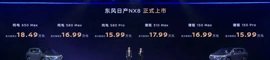 东风日产NX8来了,七款,定价15.99万到18.49万,置换限时再便宜一万,14.99万起,上市时间4月8日,定位中大型,五座不做七座,纯电和增程两条线一起推,你说冲不冲?