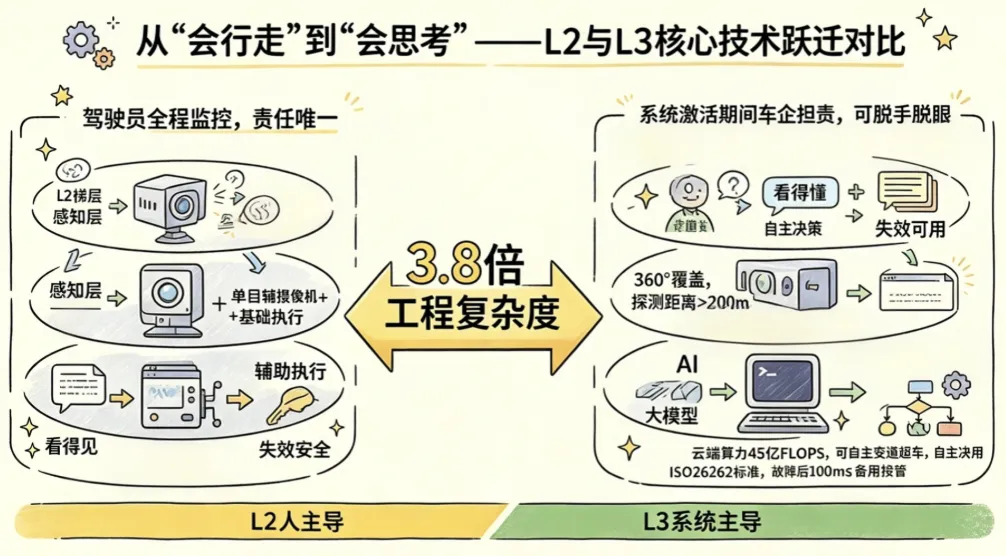从技术底层逻辑来看,L2与L3级核心差异的本质是系统在自主决策、环境感知与故障冗余能力上的根本性跃迁,责任主体的划分只是技术能力达标后的自然衍生结果。L2本质上仍属于“辅助执行”范畴,要求驾驶员全程保持监控与接管准备;而L3作为有条件自动驾驶,在系统激活状态下支持驾驶员脱手、脱眼,驾驶责任正式开始向车辆系统迁移。据《汽车工业学报》2026年相关研究显示,L2到L3的技术跨越,堪比从“会行走”到“会思考”的升级,工程实现复杂度达到L2的3.8倍。L3的技术突破集中体现在感知、决策、执行三大层面的全面进化:感知环节从“看得见”升级为“看得懂”,多传感器融合成为必备能力,激光雷达与多目摄像头的组合可实现360度无死角覆盖,有效识别距离超200米;决策层面由传统规则驱动转向AI大模型赋能,以华为乾崑智驾为例,其云端算力可达45亿FLOPS,能够自主完成变道、超车等高复杂度驾驶行为;执行层面则从“失效安全”提升至“失效可用”,通过双芯片、双制动等多重冗余设计,依据ISO26262标准,可在主系统故障后100毫秒内由备用系统无缝接管,极大提升了自动驾驶的安全性与可靠性。