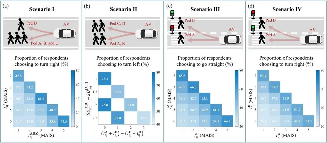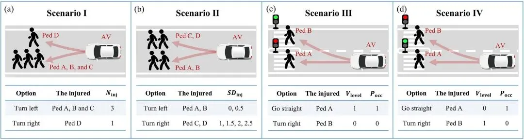 方法部分首先识别并形式化了五种具有广泛社会共识的道德偏好,并分别定义与之对应的道德变量:降低总体伤害对应“量化伤害严重程度” Iq,降低个体伤害对应“受伤人数” Ninj,确保平等关怀对应“伤害严重程度标准差” SDinj,保护守法者对应“违规程度” Vlevel,避免主动伤害对应“路径占用程度” Pocc。随后,作者在中国开展大规模在线调查,通过问卷平台收集公众在四类典型自动驾驶伦理困境场景下的选择结果;图1展示了这些调查场景及其中被控制变化的道德变量,场景设计遵循“单场景仅改变特定变量”的原则,并引入不同等级的 MAIS 伤害量化组合,使受访者在更贴近真实交通风险的条件下作出判断。基于问卷结果,研究用 softmax 形式把公众在两种选项之间的选择概率与代价函数关联起来,从而拟合公众在不同道德偏好之间的权衡方式。