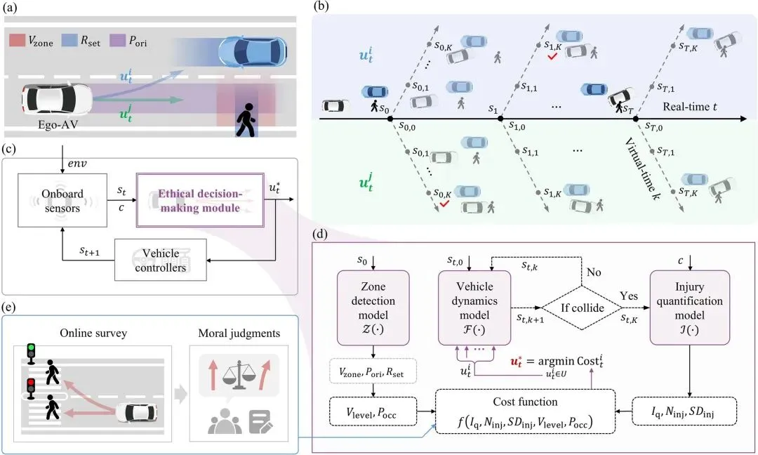 接着,作者构建了完整的伦理决策算法框架,图2展示了其总体流程:当自车进入不可避免碰撞阶段时,算法在虚拟时间域中枚举 25 种由纵向控制和横向控制组成的决策组合,结合区域检测模型、车辆动力学模型和伤害量化模型,预测各候选动作下所有道路使用者的伤害结果,并将前述五个道德变量共同输入代价函数,选出总代价最小的决策在真实时间域中执行。