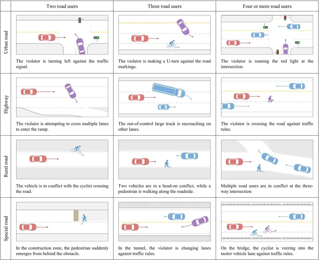 为了验证算法性能,研究参考既有文献中的伦理困境和真实交通条件设计了 60 个基础场景,并在每个基础场景下进一步改变自车横向位置、纵向位置、速度和算法触发时机,形成 4860 个测试场景;图3给出了部分基础场景示意,覆盖城市道路、高速、公路和特殊道路等多种环境。