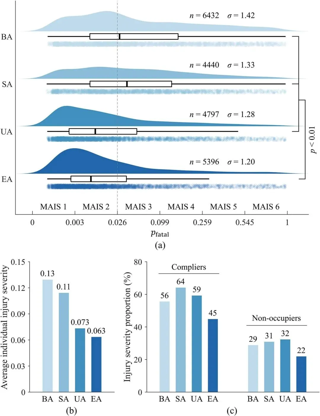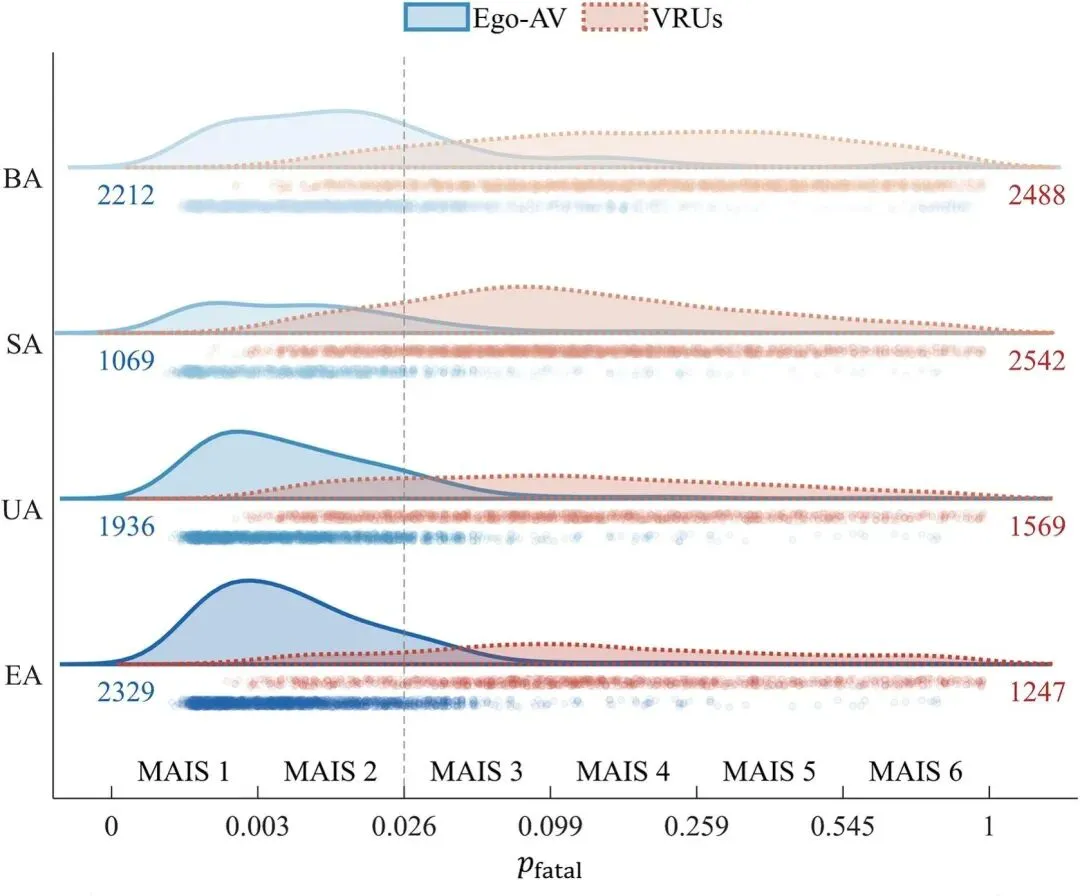 图7从对象类型角度补充说明,脆弱道路使用者因缺乏保护通常伤得更重,而 EA 将受伤的脆弱道路使用者数量较 BA 减少了 50%;尽管这会带来自车乘员受伤人数上升的代价,但作者认为其带来的整体伦理收益更大。