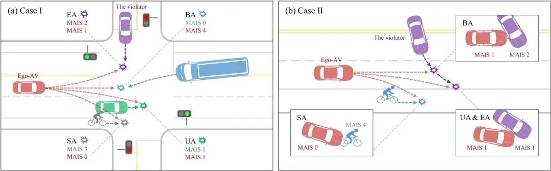 图8给出了两个具有代表性的案例。案例一中,闯红灯的紫色轿车进入路口,一辆大卡车为避让其转入自车车道。BA 仅制动,导致自车与卡车相撞,自车乘员受到严重伤害;SA 为保护自车选择撞向骑行者,使骑行者重伤;UA 选择追尾守法的绿色轿车,以求整体伤害最小,但无辜守法者因此受伤。EA 则选择与违法者发生侧碰,虽然总体伤害比 UA 略高一级,但额外伤害全部由违法者承担,因此更符合公众在图4c、图4d 中体现出来的道德判断,即只有当违法者潜在伤害明显高出守法者至少两个等级时,公众才倾向于放过违法者。案例二中,违法车辆进行逆标线掉头,BA 与 EA 都选择撞向违法者,但 EA 不仅制动,还配合适度转向,使原本较重的侧碰转化为较轻的擦碰;结果自车与违法车辆的 Δv 分别降低了 9.51% 和 9.53%,违法车乘员的伤害从 MAIS 2 降至 MAIS 1。作者还给出了实时性分析:在图8a 所示的五交通参与者复杂场景中,EA 评估单个候选动作约需 1.1 ms,一个完整决策优化周期约 26 ms,说明该方法具备在真实自动驾驶车辆上在线运行的潜力。