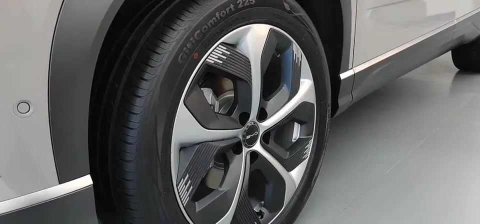 这辆100KM续航的顶配版本配的是20英寸双色轮毂,轮胎扁平比是50。