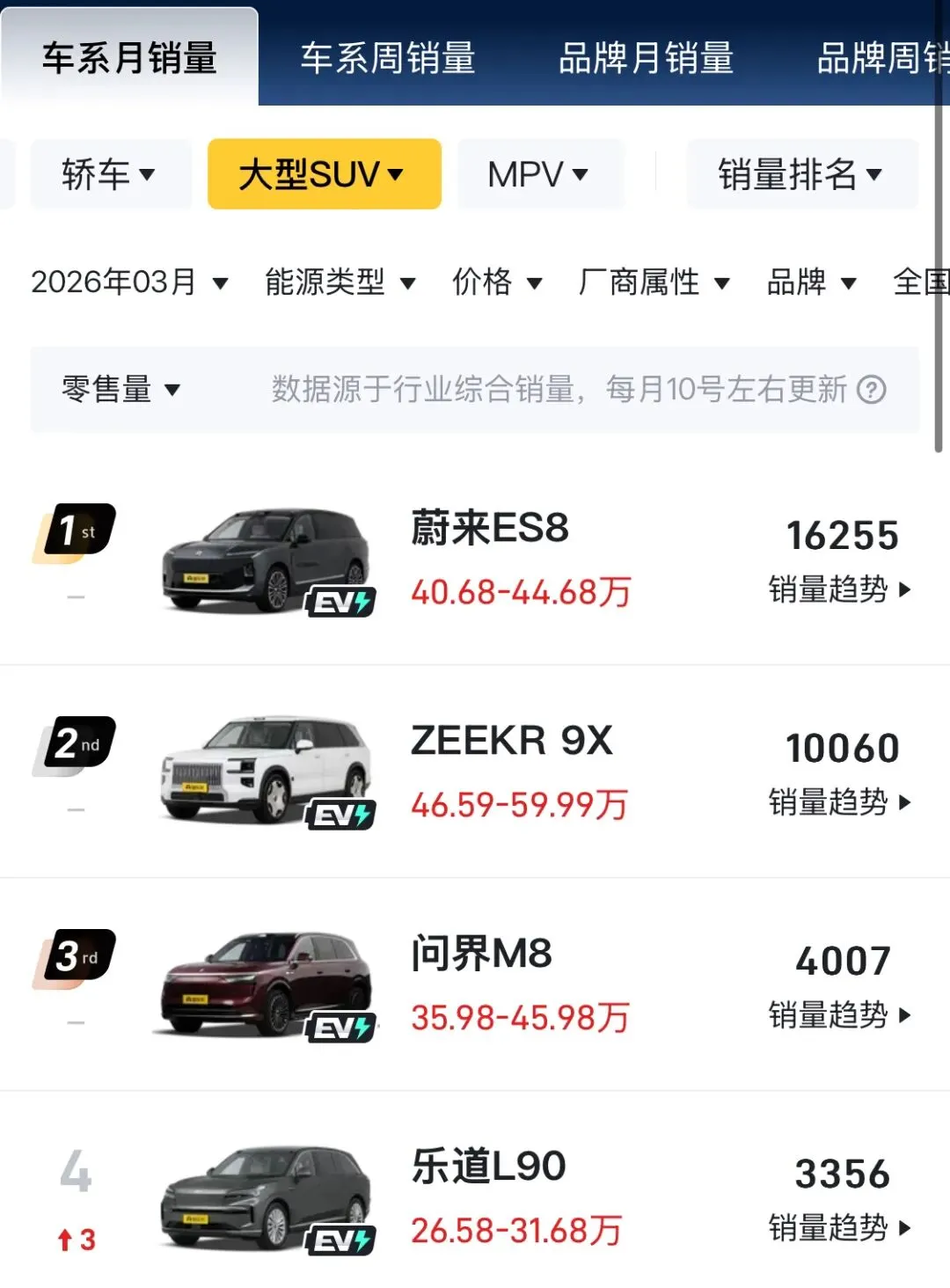 3月大型SUV销量前三是蔚来ES8、极氪9X、问界M8,但ES8和M8均价都在40万级,真正站稳50万+高端价位,还能月销破万的,只有极氪9X这一台。