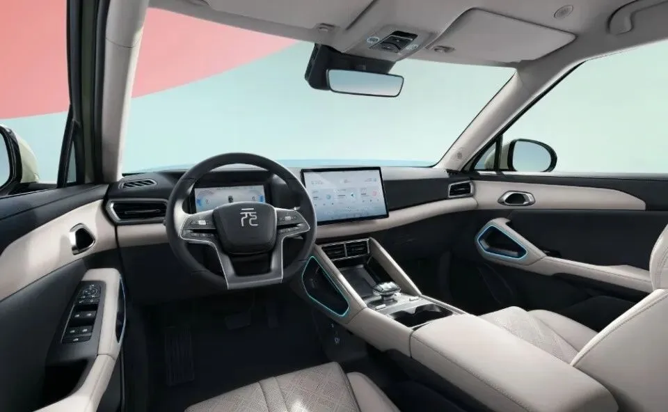 内饰没用廉价塑料,中控台一大片软包,配上铝合金饰条,不像七万块的车。12.8英寸屏用的是6nm芯片,点导航、切歌、调空调,基本不卡。我朋友说他上一辆车是吉利银河L6,屏一样大,但反应慢半拍,元UP真快。四个Type-C口,前排两个快充,后排两个常电,露营带个小冰箱+投影仪,不用接逆变器,直接插上就行。