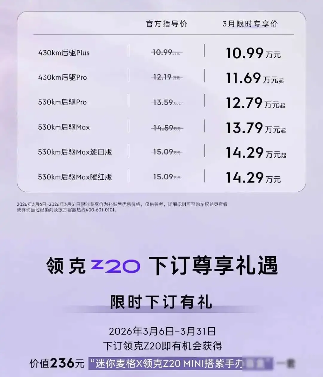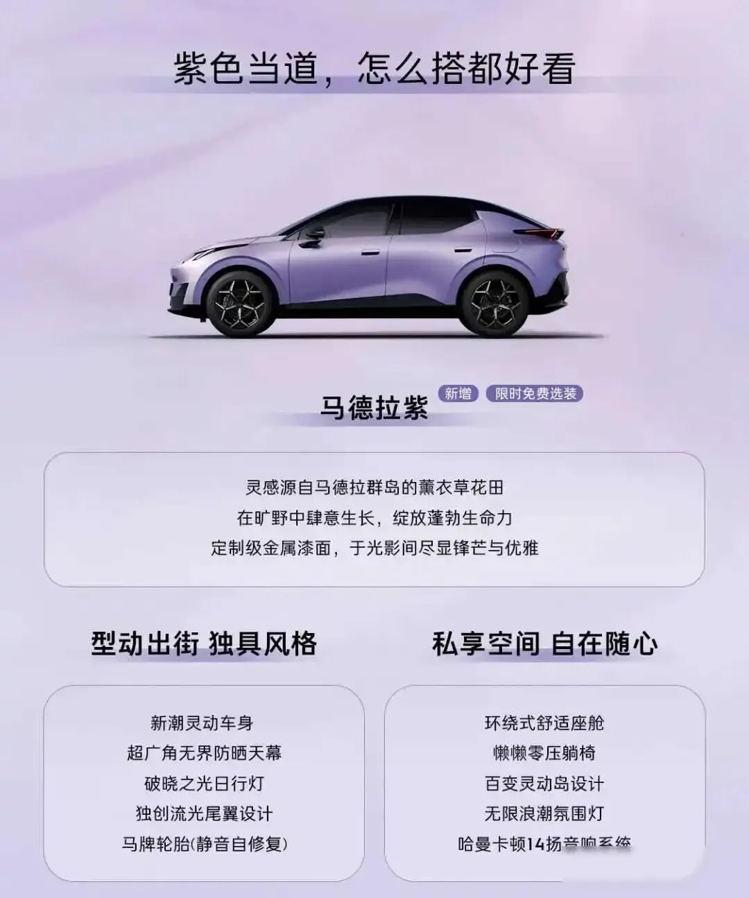今天刷到领克Z20出了紫色款,价格从十万九千九百块起,朋友问我这车咋样,我就把看到的说一说,新车叫马德拉紫,听说是参考了葡萄牙那边的薰衣草田,但到底啥颜色,还是得去店里亲眼看看,现在订车送手办盲盒,还有补贴和选装基金,算下来能省好几千块。