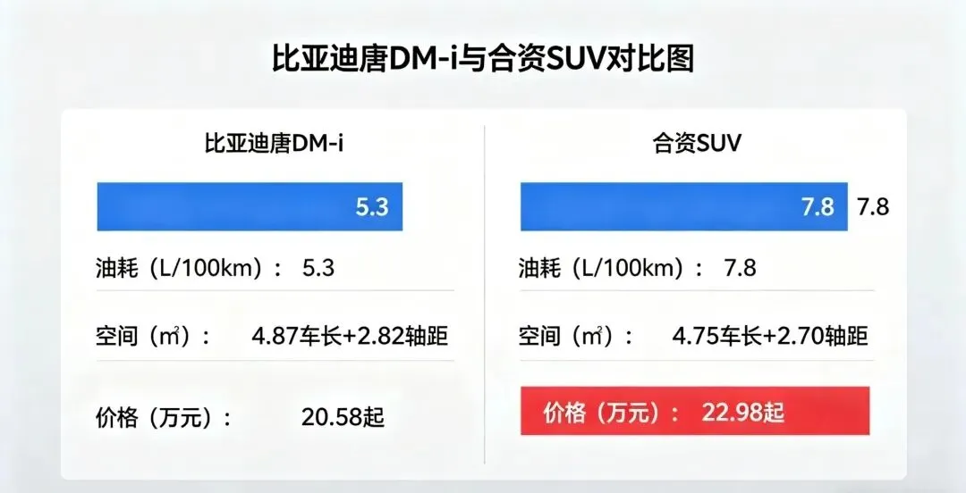 唐DM-i的热销,不仅是一款车的成功,更是一个时代的缩影。它宣告了“高溢价、低配置、高油耗”的传统合资燃油SUV模式,已经走到了尽头。