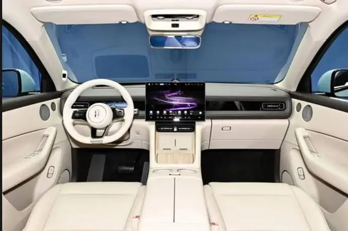 内饰主打豪华智能,提供紫慕白、韶华杏、雀羽红等多种双拼配色,辅以木质饰板与麂皮材质。配备大尺寸中控屏 + 液晶仪表,搭载华为鸿蒙车机系统,支持多屏联动、连续语音交互、车家互联等功能;