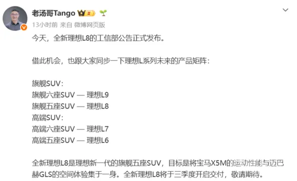 近日,理想汽车产品线负责人“老汤哥Tango”发文称,全新理想L8的工信部公告正式发布。借此机会,也跟大家同步一下理想L系列未来的产品矩阵: