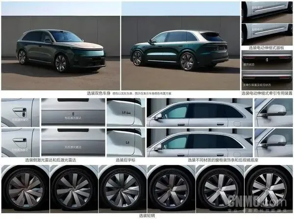 此外,全新一代理想L8提供了丰富的选装配置,包括侧/后激光雷达、电动伸缩踏板、电动伸缩式牵引专用装置、双色车身、轮辋等。