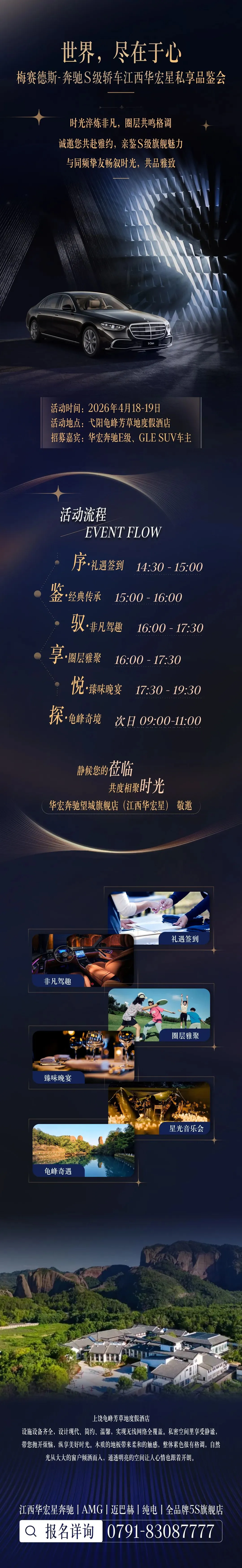• 活动主题:世界,尽在于心——梅赛德斯-奔驰S级轿车江西华宏星私享品鉴• 活动时间:2026年4月18日-19日(2天1夜专属尊享之旅)✅S级深度品鉴:解读百年豪华底蕴,感受旗舰车型前沿科技与匠造工艺✅专属试驾体验:亲身驾驭奔驰S级,畅享卓越操控与静谧驾乘感受✅精英圈层雅聚:同频车主相聚,以车会友,共赴高端品质社交✅户外绿茵竞技:自然间舒展身心,趣味互动拉近彼此情谊✅星光BBQ派对:晚风、美食、音乐相伴,尽享惬意度假时光✅龟峰风光探秘:登临丹霞胜境,纵览山间奇景,邂逅自然人文之美活动对象:华宏奔驰E级/GLE SUV车主(限2大/2大1小)• 报名费用:399元/组,报名即赠价值399元奔驰原厂背包•参与限制:因含户外攀爬环节,为安全起见,谢绝6岁(含)以下、55岁(含)以上人员参与•报名方式:扫描专属报名二维码,填写姓名、电话、车牌号、身份证号(统一购买保险)