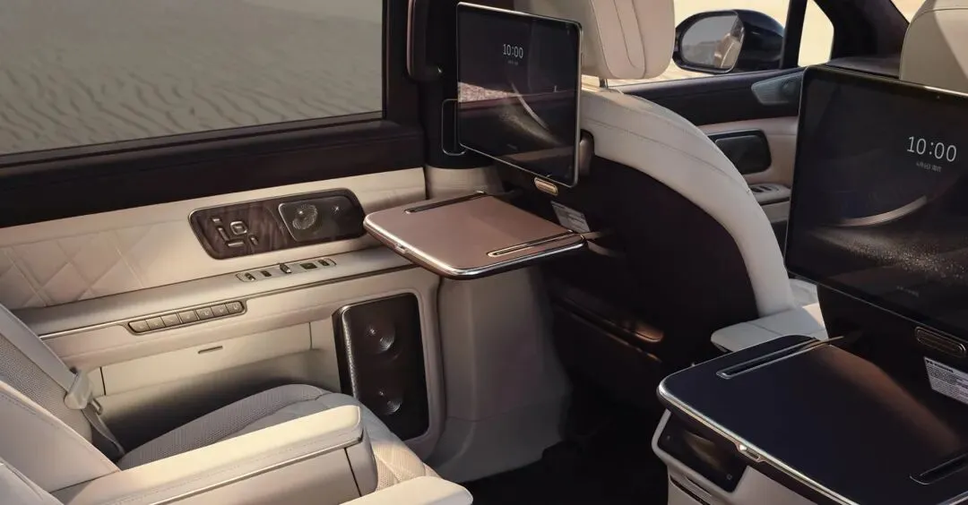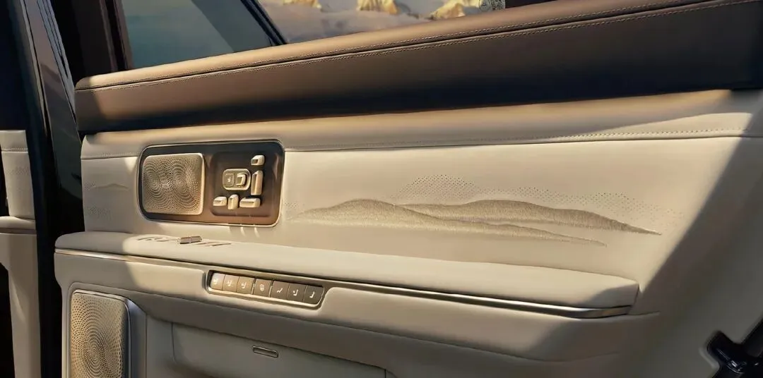 9.全球首发阵列式LC调光车窗(0.1秒变色),后排双16英寸OLED行政屏、车载飞书会议系统。