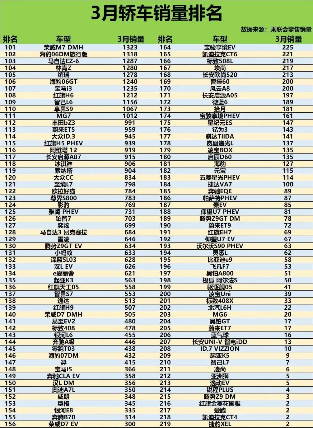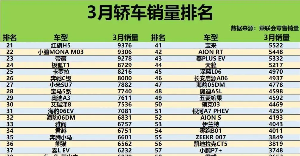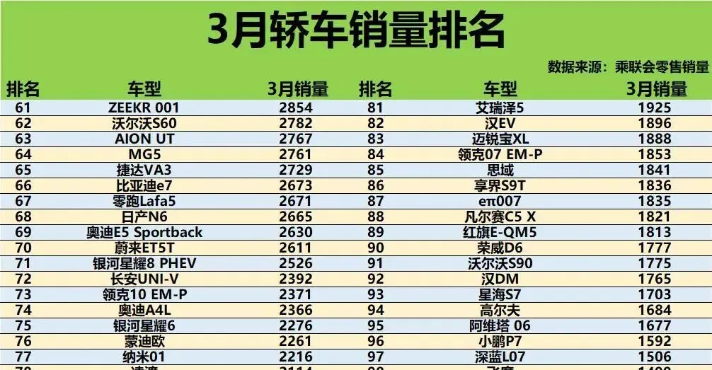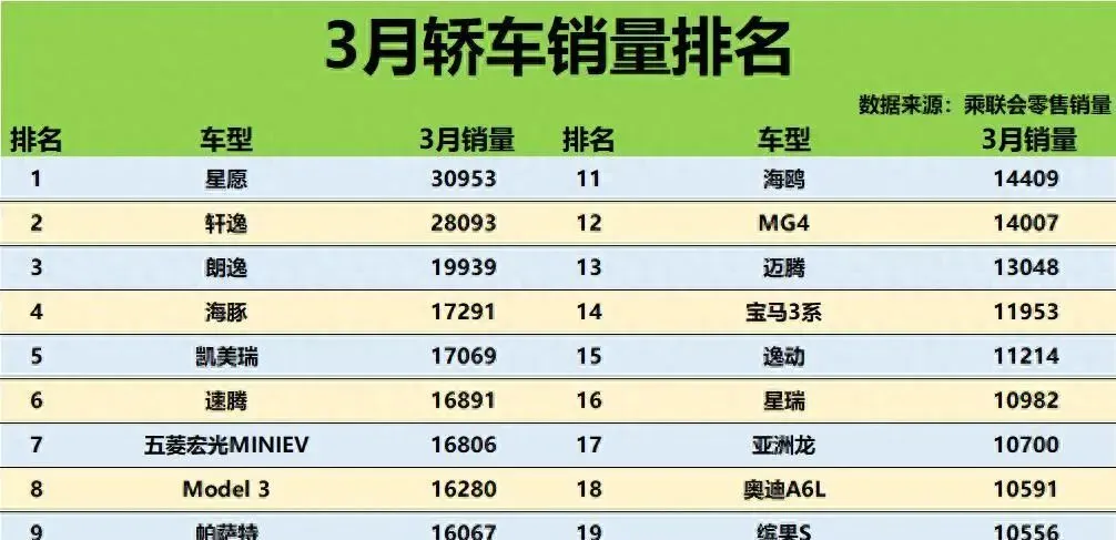 3月轿车销量榜:星愿领先,轩逸反弹,新能源热度遇冷