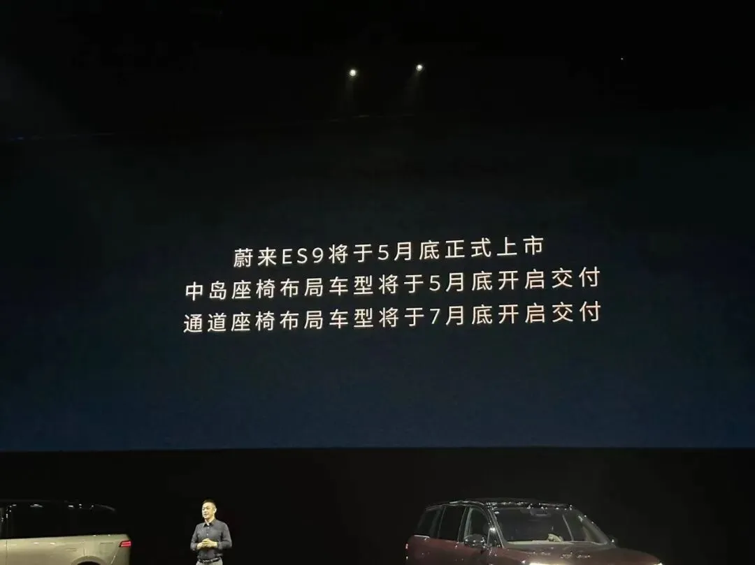 4月9日,蔚来汽车正式发布了品牌尺寸最大的旗舰SUV——蔚来ES9,同时正式发布预售,预售价为52.8-65.8万元,采用BaaS电池租赁方式购买售价为42-55万元。新车为一款全尺寸SUV,被官方定义为“智能电动行政旗舰SUV”。新车搭载了“天行智能底盘”、全域900V高压架构、线控转向、神玑NX9031智驾芯片、SkyOS·天枢整车全域操作系统、Skyline天际线屏幕等蔚来最新技术。新车预计将于5月底正式上市,中岛座椅布局将5月底开始交付,通道座椅布局将7月开始交付。