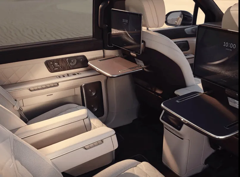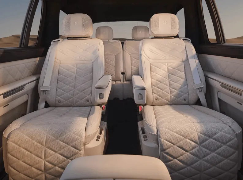车内座椅采用2+2+2六座布局,并且后排会提供中岛版和过道版,其在二排中央区域配备8英寸操控屏以及两个隐藏式小桌板。车辆后排将会配备飞航零重力座椅,支持加热、通风以及按摩等功能,另外还会提供电动遮阳帘、智能矩阵阅读灯以及两个娱乐屏。第三排座椅则会配备电动调节、加热和手动遮阳帘等等。此外,地平线特别版的车门饰板还融入“山形刺绣”等中式元素提升豪华感。