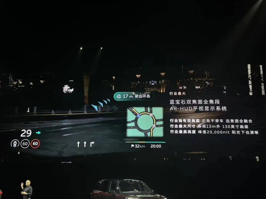 ES9搭载全新的蓝宝石双焦面全焦段AR-HUD,可以等效13m外130英寸的显示面积以及拥有峰值20000nit的亮度。相应更加灵敏,显示更清晰。
