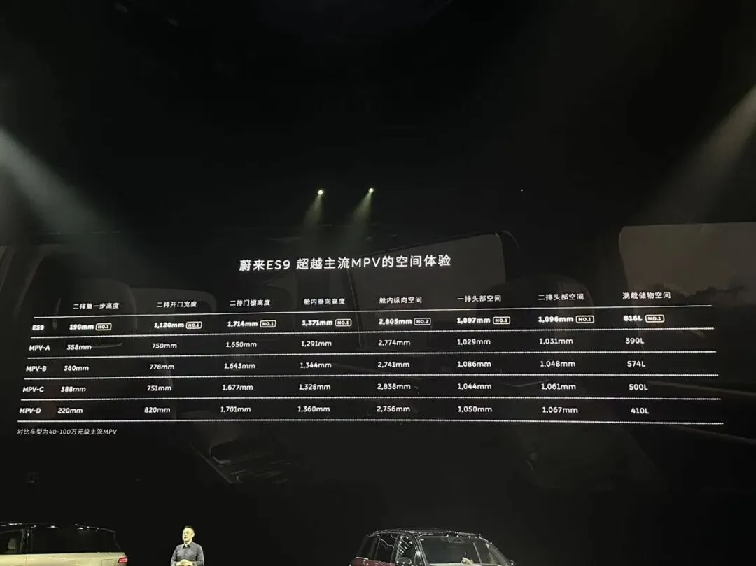 蔚来ES9在空间方面,和多款主流MPV在各项细分参数上进行了对比,做到了SUV达到了MPV般的空间表现。