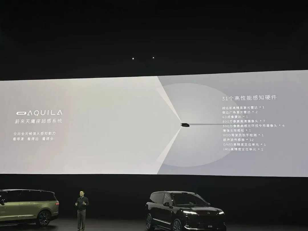 智能驾驶方面,ES9搭载自研5nm神玑NX9031芯片(超500亿晶体管)与三激光雷达(车顶+前翼子板),配合AQUILA天鹰座超感系统,实现360°无死角环境感知。辅助驾驶软件方面,继续采用世界模型NWM+闭环强化学习。
