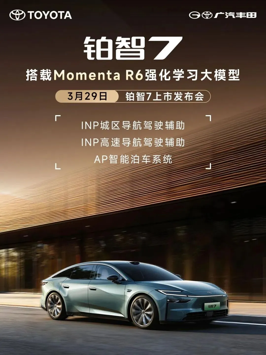 广汽丰田铂智7是广汽丰田2026年3月29日正式上市的中大型纯电旗舰轿车,基于e-TNGA架构打造。目前主销5个官方版本,全系标配华为DriveONE电驱、鸿蒙座舱5.0,核心差别集中在纯电续航、高阶智驾、舒适配置、底盘素质四大维度。