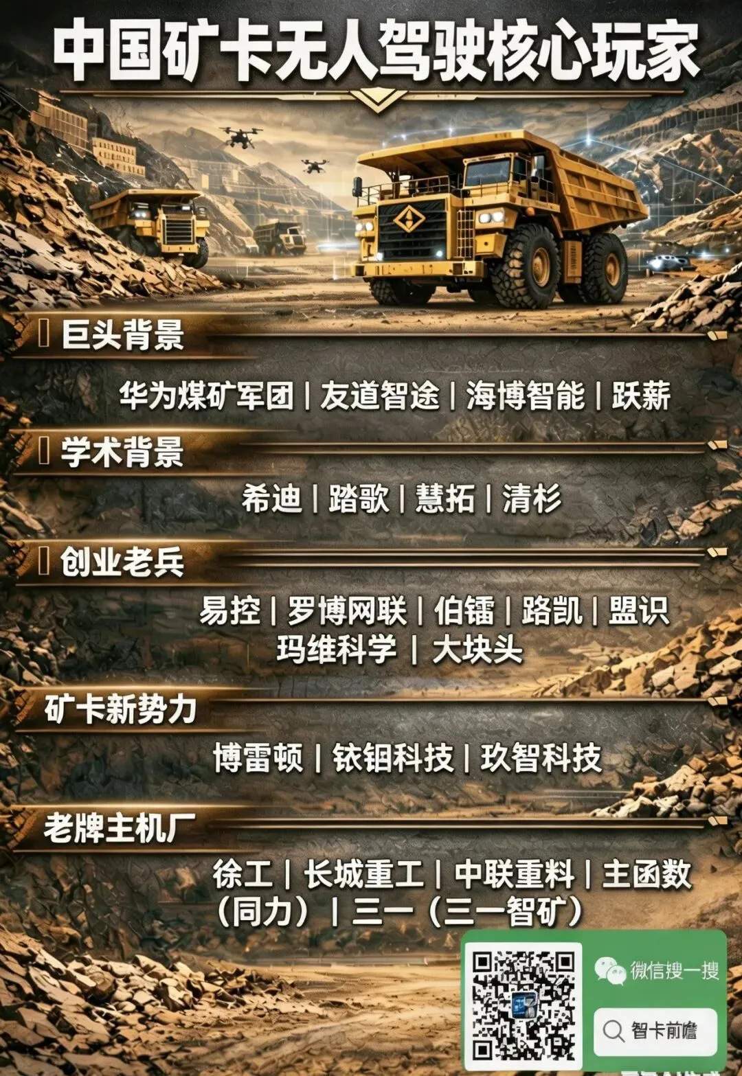 当干线物流自动驾驶还在摸索落地路径之时,矿区自动驾驶赛道正上演着另一番沸腾景象。新疆准东露天煤矿的晨曦中,易控智驾的无人矿卡踏着朝露穿梭,扬起漫天煤尘;内蒙古黑岱沟矿场里,希迪智驾的设备与电铲、推土机协同作业,“采、运、排”全流程无需人工干预;华为的车路云协同技术早已渗透50+矿区,矿鸿OS的数字脉络悄然覆盖一座座千万吨级矿山。目前为止,我国在运行的无人驾驶矿卡数量已达4200+辆,让矿区赛道一跃成为全球自动驾驶领域能与robotaxi抗衡的产业高地。今天,我们就来拆解这场关乎中国工业智能未来的矿区争夺战。