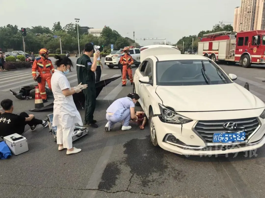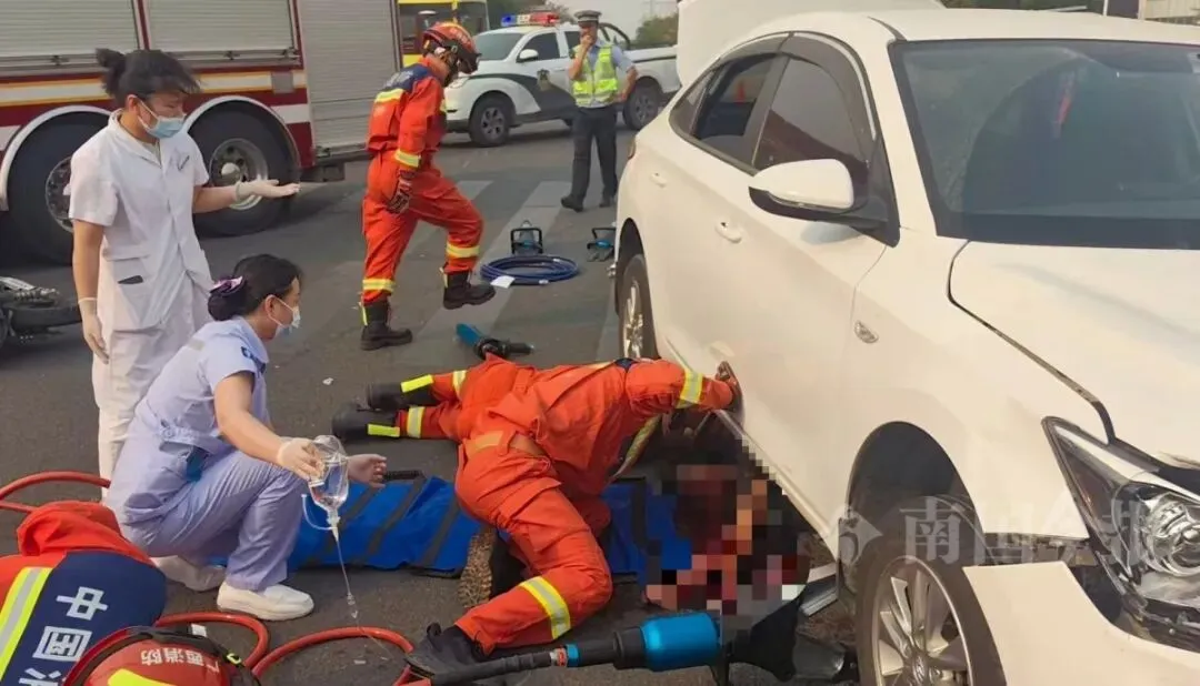 消防救援人员到达现场经侦察发现,一辆白色轿车行经斑马线时,与一辆搭载3人的无牌两轮电动车发生碰撞,导致电动车上其中一人下半身被卷入轿车车底,卡在底盘下。