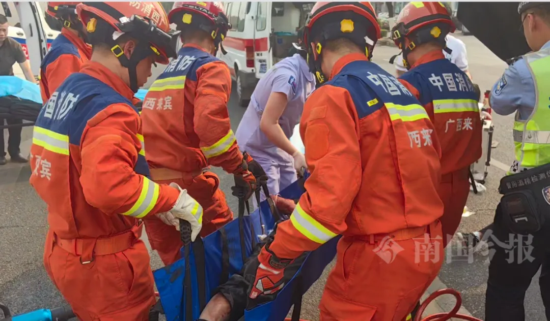 4月11日下午,来宾市消防救援指挥中心接到报警:兴宾区桂中大道汽贸园附近发生一起交通事故,1人被困车底,情况紧急。兴宾区消防救援大队金锋路站立即赶赴现场处置。