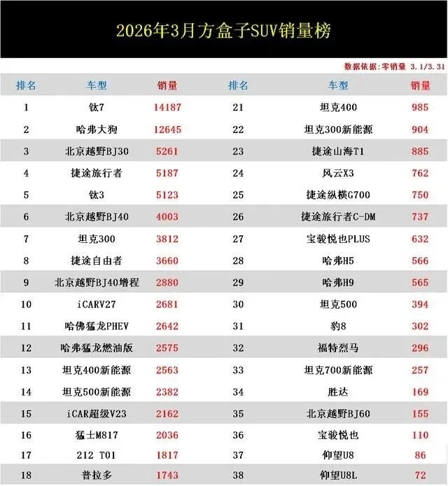 这波行情真是没想到,憋了整整两个月,大家都以为车市还得在泥潭里挣扎一阵子,结果三月份这一脚油门直接踩到底了。特别是咱们今天要聊的这个“方盒子”圈子,那叫一个热闹非凡,简直就是久旱逢甘霖,各家车企脸上总算能见着点笑容了。