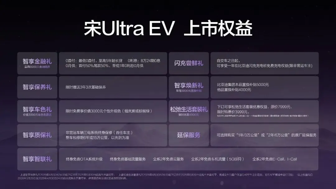 比亚迪王朝宋Ultra EV 共4款车型,包括605KM领先型、605KM超越型、710KM超越型和710KM卓越型,官方指导价15.19万-17.99万元。新车全系搭载比亚迪第二代刀片电池及闪充技术,同时拥有710公里CLTC纯电续航、天神之眼B、云辇-C、TBC高速爆胎稳行系统等豪华配置,为消费者带来全新的纯电出行方式,全面开启闪充时代。比亚迪王朝正在构建一个从购车、用车、到养车的全链路无忧体系。为此,宋Ultra EV带来了“0元购、0元用、0元养”的超重磅购车权益!同时还有其他丰富权益,为用户带来超值购车体验。宋Ultra EV全系标配超100项实用配置,包括第二代刀片电池及闪充技术、主副驾座椅记忆、带遮阳帘的全景天幕、电动后尾门、15.6寸大屏、前备箱电动解锁、前排远端气囊、螺纹接口等,入门即满配,绝对是2026年最值得入手的SUV。在本次发布会的现场,比亚迪汽车王朝网浙闽战区大区经理张怡超先生也为杭州地区的宋Ultra EV车主进行了专属的交车仪式,与用户一同开启闪充赋能的出行新篇。本次宋 Ultra EV杭州上市,以全面越级实力搭配诚意满满的购车权益,树立B级纯电 SUV 全新价值标杆,必将成为市场爆款。未来,比亚迪将继续以技术创新为核心,以用户需求为导向,引领消费者开启便捷、舒适、安全的纯电出行时代。