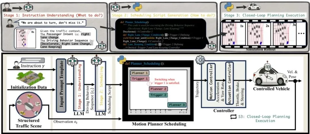 图2:由LLM驱动的以调度为中心的框架。它利用LLM解释乘客指令并生成可执行脚本。然后,该脚本调度多个运动规划器,利用实时反馈来实现指令。整个框架的精髓,可以用一句话概括:“LLM动脑不动手,专业规划器动手保安全”。它清晰地分成了三层:乘客说“我觉得不安全”。系统会把当前的交通状况(如“本车在中间车道,右侧车道车流更稀疏”)转换成一段文字描述,连同指令一起喂给LLM。LLM利用其强大的语义理解和世界知识,输出一个结构化的原子驾驶行为序列,比如:`[减速,向右变道,车道保持]`。这里限定了只有5种原子行为:车道保持、左变道、右变道、加速、减速。这个限制很重要,把天马行空的LLM输出锚定在了可控范围内。第二层:调度脚本生成(还是LLM的活儿,但只干一次)