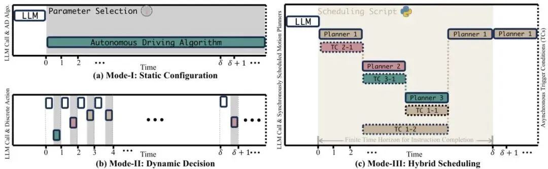 这是本文最核心的创新!LLM在理解意图后,不会频繁被调用,而是一次性生成一个可执行的“调度脚本”。这个脚本做两件事:1. 规定行为序列的执行顺序;2. 为每个行为切换设置异步触发条件。比如:“先执行‘减速’行为,直到与后车距离大于20米且车速低于60km/h时,触发切换到‘右变道’行为;变道完成后,自动切换到‘车道保持’行为。”图3:从调度角度对LLM驱动的AD方法进行分类。(a) 模式一:LLM在启动时设置系统参数,适用于静态偏好配置。(b) 模式二:LLM在动态交通中持续参与驾驶决策。(c) 模式三(本文):LLM单次调用产生调度脚本,使用异步触发器实现上下文自适应。TC 2-1表示规划器2的第一个触发条件。论文将现有LLM+驾驶的方法分成了三类(图3)。本方法属于模式三,它巧妙结合了模式一(单次调用,低开销)和模式二(能响应动态环境)的优点。脚本生成后,LLM的活儿就干完了。接下来,一个高速运行的“调度-规划-控制”内循环开始工作。“调度器”监控实时感知数据,一旦满足脚本里的触发条件,就切换“规划器”。每个原子行为(如左变道)都有一个对应的、基于模型预测控制的专业运动规划器。MPC规划器利用高精地图和车辆模型,在滚动时域内优化出安全、舒适的轨迹,最后由底层的控制器(如LQR)转换成油门、刹车、方向盘信号。看明白了吗?LLM只负责高层的、低频的语义理解和全局调度决策;而低层的、高频的、安全攸关的连续轨迹规划和车辆控制,完全交给传统、可靠、可验证的规划控制模块。这就好比LLM是公司的CEO,制定战略和计划(脚本),而各个部门的专业经理(MPC规划器)负责具体执行,确保任务安全落地。透明决策链:从“说人话”到“安全开”